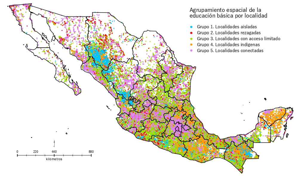 Figura 1. Agrupamiento espacial de las características de la educación básica por localidad en México. Fuente: Elaboración propia.